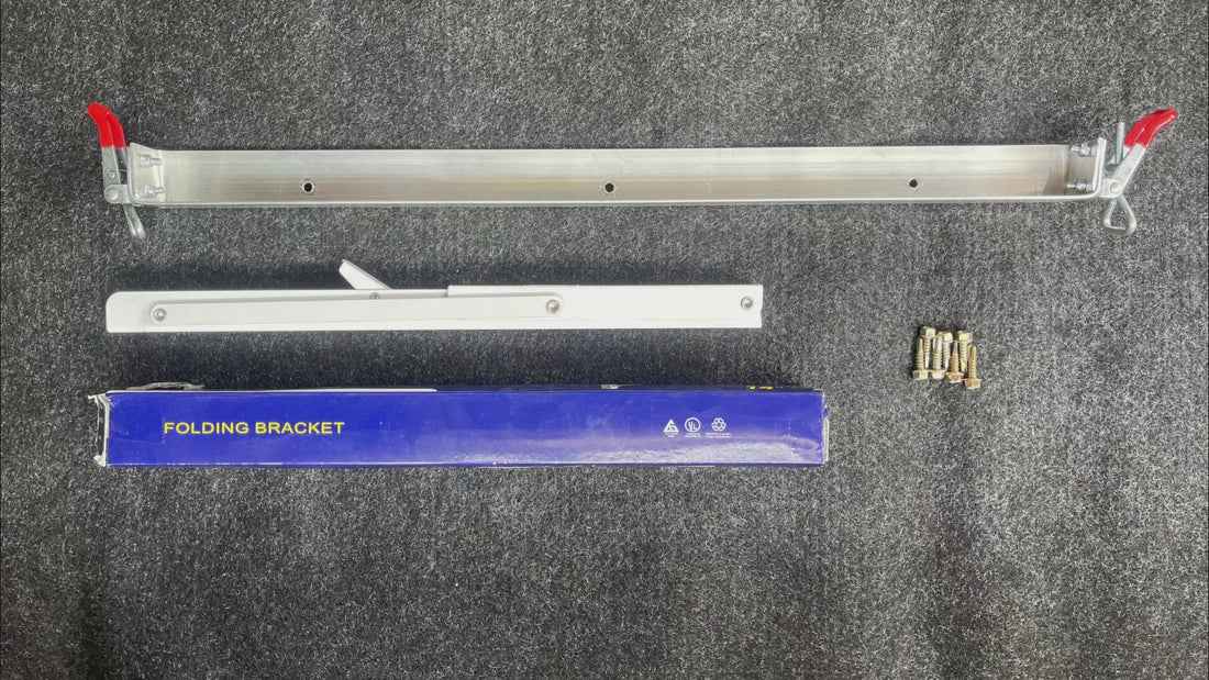 2. The Base plate must be mounted underneath support beams inside the canopy roof so that when the Folding Lockable Angle Bracket is mounted to the support beams, the box can lean against the angle bracket.