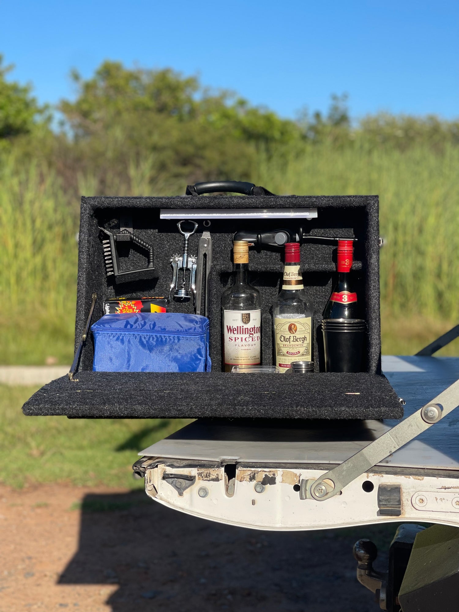 "This is the first and only design I have seen that allows for quick clip in/out portability. I take the braaibar box out and put it next to the braai area whilst camping for quick access to the equipment and the dop!"